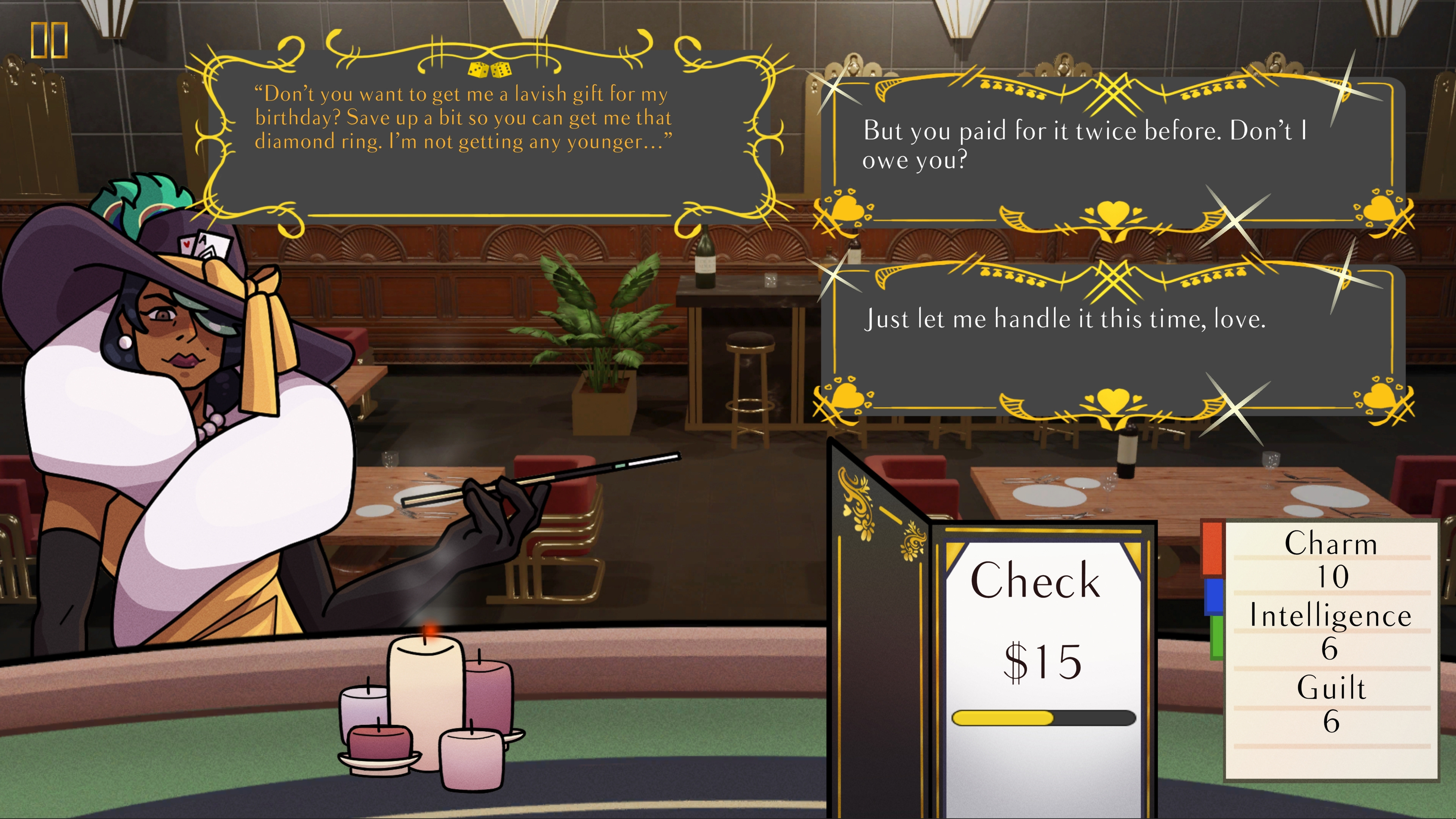 You're out on a date with Lady Luck herself, and it's time to pay the bill. However, you both want to be the one to pay it. Luck will determine who pays for dinner: You, or Lady Luck herself!